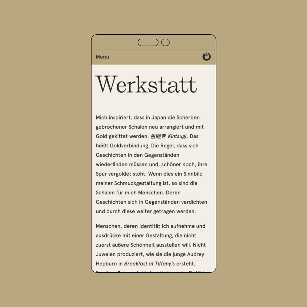 Digital redesign of Heike Burgemann’s Jewelry Workshop & Gallery in Brandenburg silence near Berlin. The design language of the website matches the design language of her jewelry creations: Loud, quiet, mezzo. Large surfaces, numerous images, striking typography; white space, focus, silence.